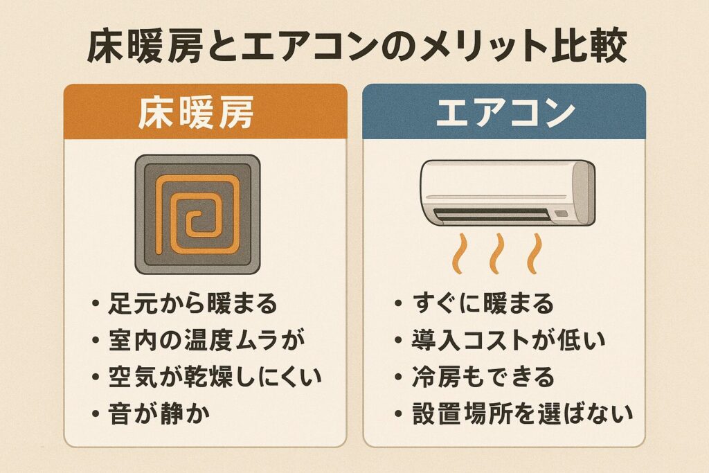 導入のしやすさと総コストの読みやすさはエアコン快適性の満足度を取りに行くなら床暖房。この整理で考えると、あなたの優先順位が見えやすくなりますよ。