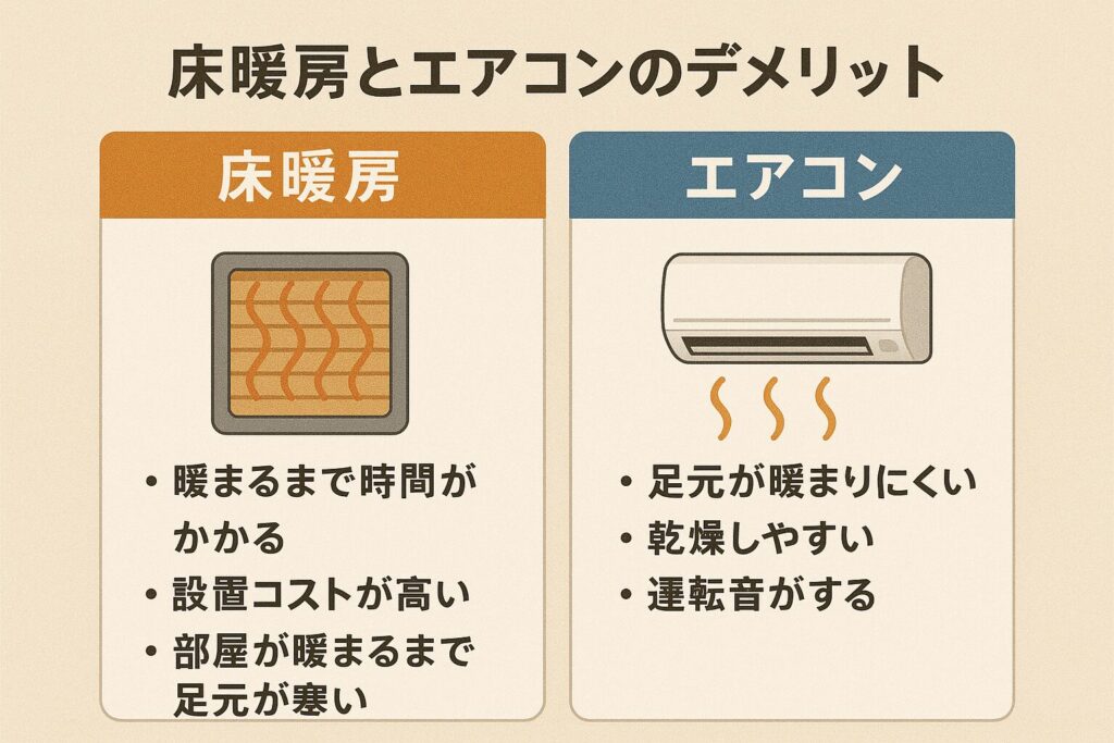 もう一つ、現実的な話をすると「温度の感じ方」は人それぞれです。床暖房が快適でも、立ち上がりが遅いのがストレスな人もいるし、エアコンの風が苦手でも、速暖の便利さが勝つ人もいます。だからデメリットは「欠点」じゃなくて「相性の問題」だと思うと判断がラクになりますよ。
