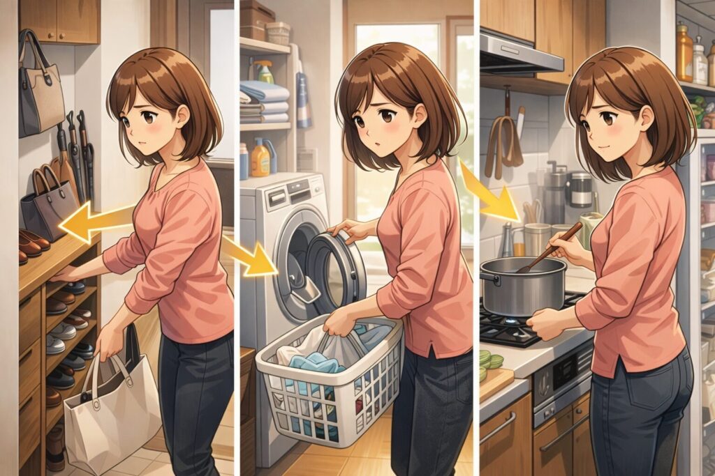 私がやるのは、朝起きてから寝るまでを口に出して動くシミュレーション。洗濯カゴをどこに置くか、掃除機やストックをどこにしまうか、買い物袋をどこに置くか。ここまで落とすと、収納の量だけじゃなく“場所”が決まってきます。