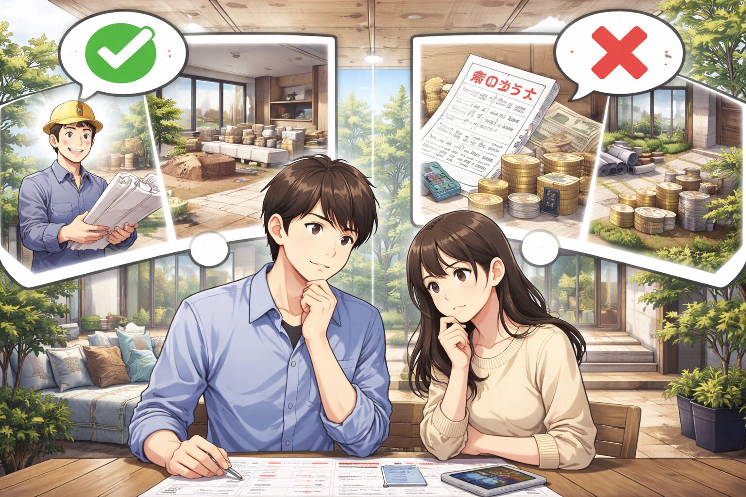 後悔の多くは「確認不足」から起きます。展示場の初回提案だけで決めず、条件を揃えて見積や仕様を整理してもらうと判断が安定します。