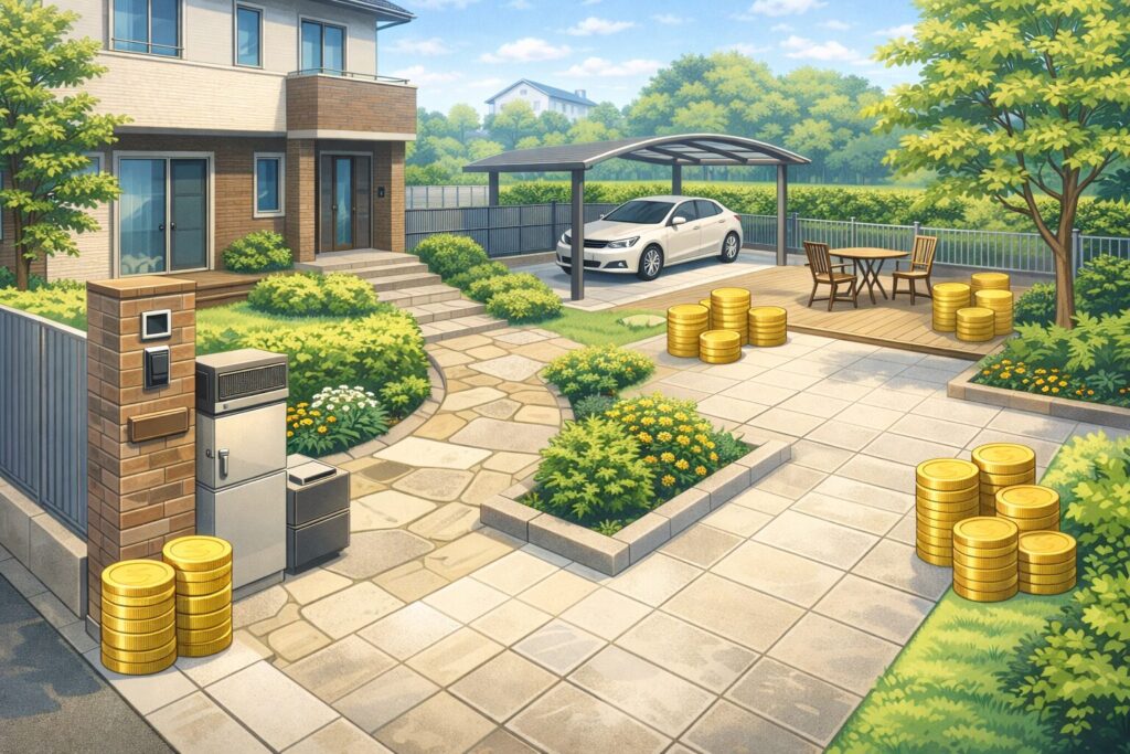 目安としては100万〜300万円くらいのレンジで語られることが多いですが、駐車台数が多い、敷地に高低差がある、目隠しをしっかり作る、タイルデッキや中庭にこだわる…となると、上に伸びます。