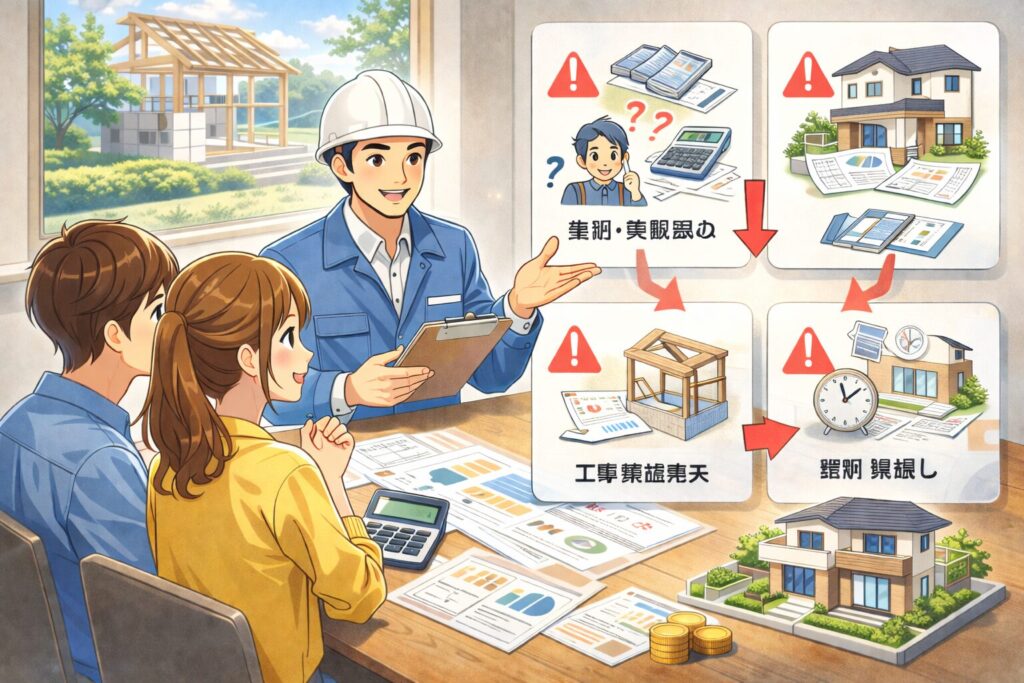 ここからは「見積が増えやすい落とし穴」と「増えても慌てない対策」をまとめます。積水ハウスは提案の幅が広いぶん、設計が固まるほど魅力的な提案が出やすいです。だからこそ、ルールを決めておかないと総額がブレます。