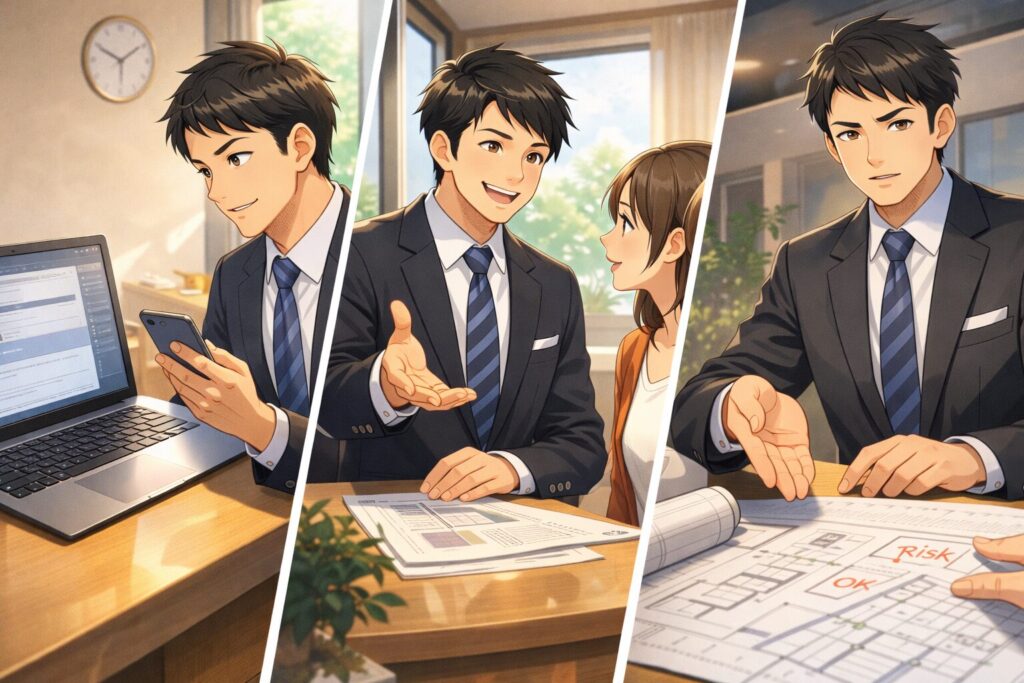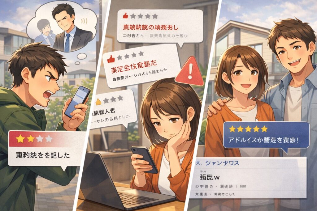 ただし、口コミで見る価値が高いのは「具体的な行動」です。たとえば、連絡が途絶えた、資料のミスが多い、説明が曖昧、契約を急かされた…みたいな行動は再現性が高い。感情の強い一撃の悪評より、同じパターンが複数出ているかを見ます。