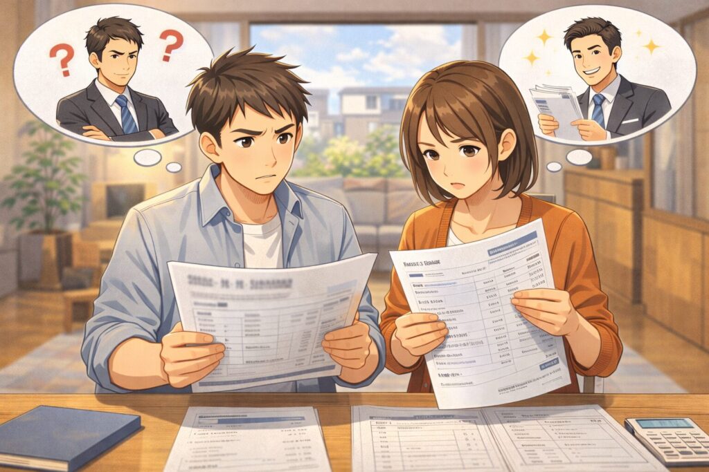 延床・性能(断熱や耐震)・標準仕様・見積範囲(外構・付帯・諸費用)を揃えた上で、説明の透明性と根拠の出し方を見ると、営業の差がはっきり出ます。